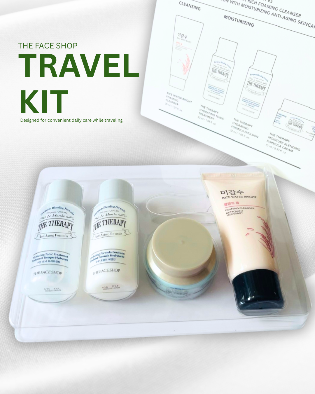 Compact, travel-friendly skincare regimen covering cleansing, treatment/serum, moisturizing emulsion, and rich cream. Designed for convenient daily care while traveling or sampling The Face Shop’s core products. Lightweight emulsion and nourishing cream provide layered hydration suitable for various skin types. Pouch keeps products organized and TSA-friendly.