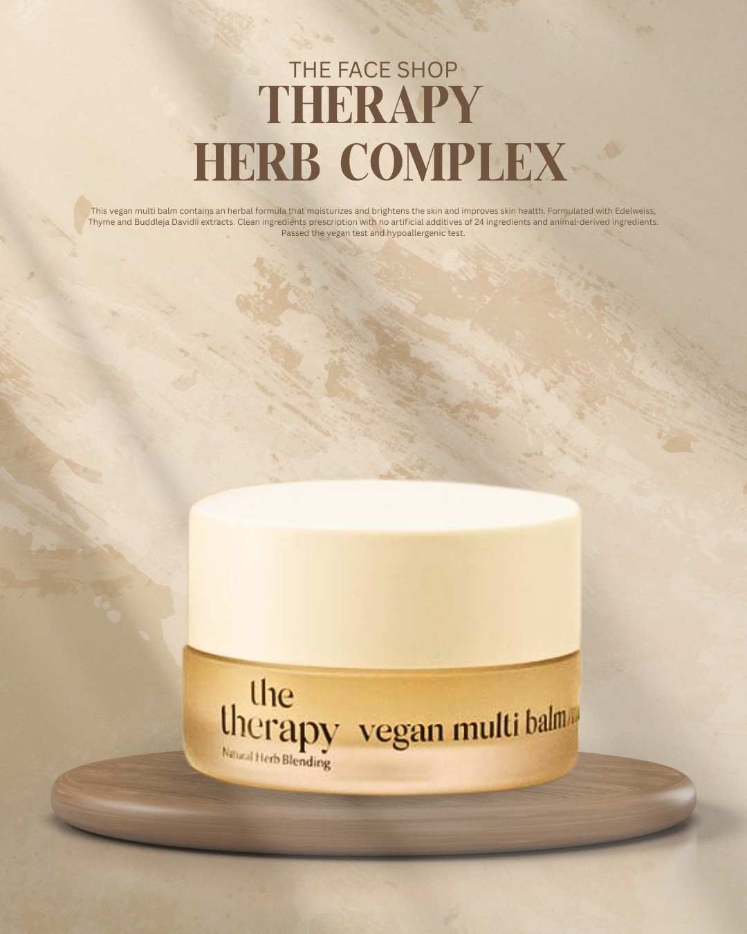 Benefits: This vegan multi balm contains an herbal formula that moisturizes and brightens the skin and improves skin health. Formulated with Edelweiss, Thyme and Buddleja Davidii extracts. Clean ingredients prescription with no artificial additives of 24 ingredients and animal-derived ingredients. Passed the vegan test and hypoallergenic test.